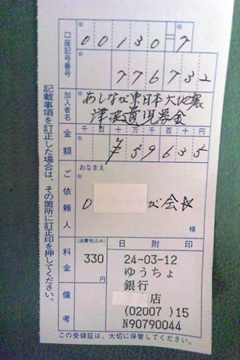 あしなが東日本大地震・津波遺児募金へ59635円の振込報告。